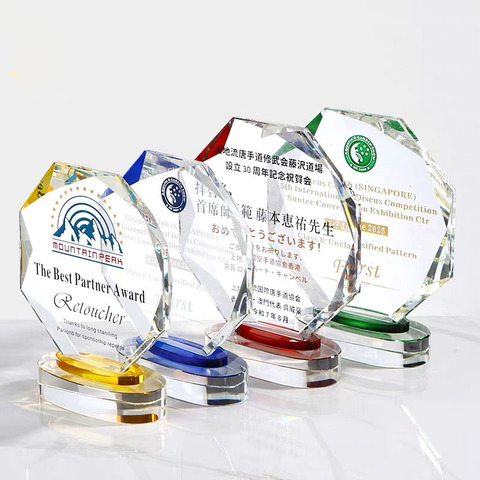 ถ้วยรางวัลคริสตัลทรงแปดเหลี่ยมทำจากคริสตัลพร้อม MH-N268ฐานคริสตัลสีแดงเขียวน้ำเงินเหลือง